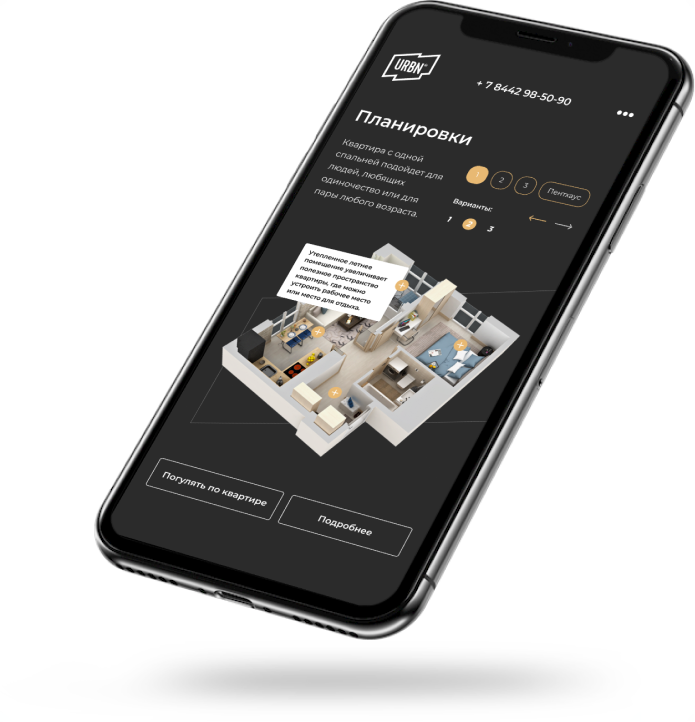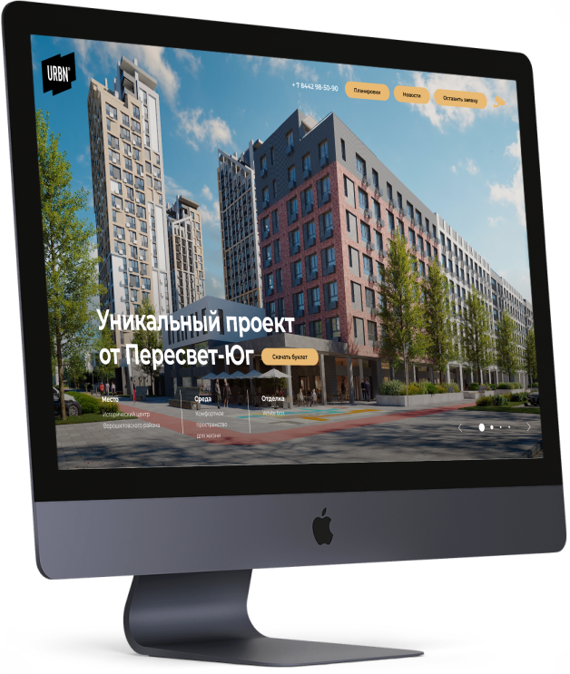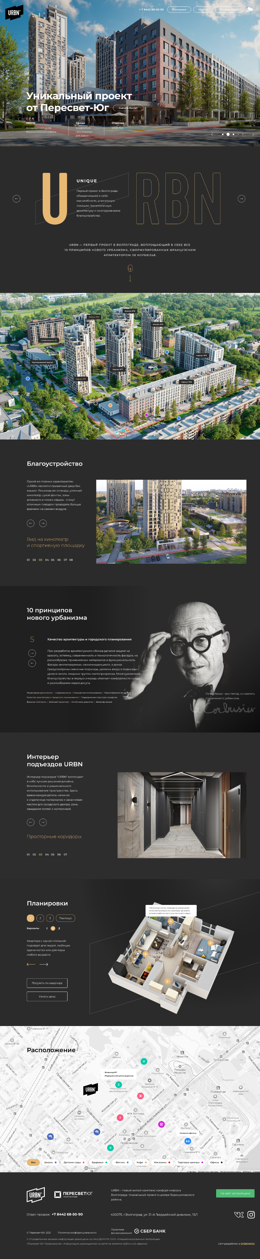 Современный сайт жилого комплекса с обширным функционалом и полностью соответствующий бренд-концепции URBN. Реализованы интерактивная карта застройки, карта местности, интерактивные планировки и многое другое.